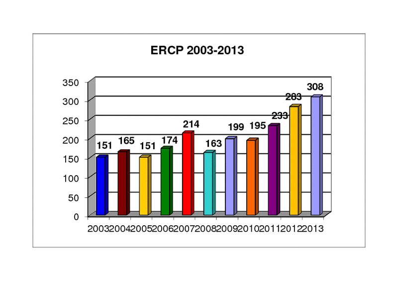In den letzten Jahren haben wir im Schnitt 180 bis 200 Untersuchungen pro Jahr durchgeführt und konnten dabei ein beachtliches Leistungsprofil anbieten. Der Trend geht dahin, dass immer weniger diagnostische Untersuchungen durchgeführt werden, sicher auch ein Ergebnis der angebotenen MRCP. Interventionen im Rahmen der Untersuchungen sind der Regelfall, auch die in der Endoskopie tätigen Diplomkrankenschwestern nehmen regelmäßig an Fortbildungen und Schulungen teil.
