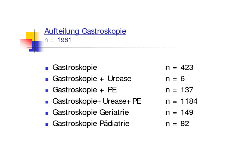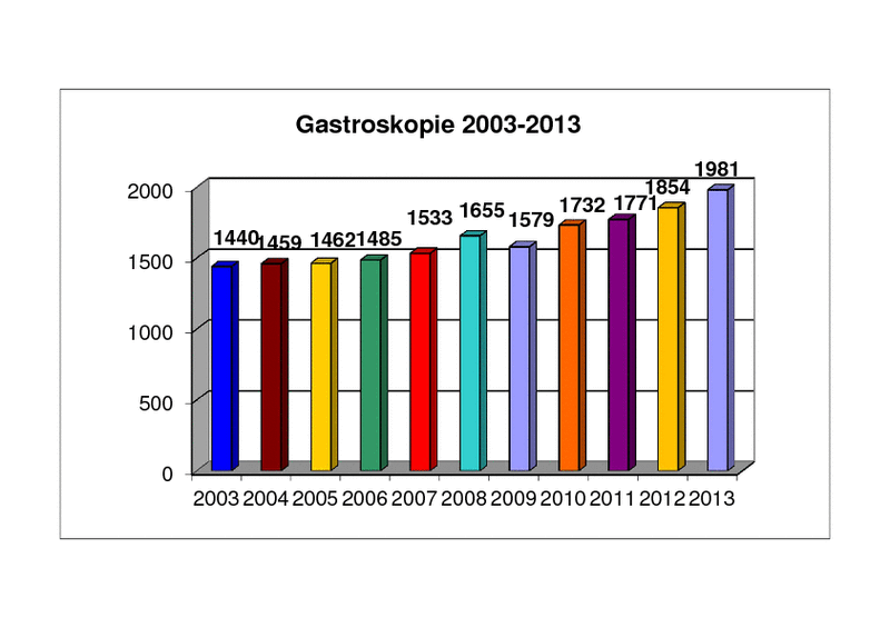 An der Endoskopie der medizinischen Abteilung werden zusätzlich die Patienten der Medizinisch Geriatrischen Abteilung, aber auch der Abteilung für Kinder- und Jugendheilkunde untersucht. Die Ärzte dieser Abteilungen untersuchen ihre Patienten selbst, für die Geriatrie wird die Pflege von der medizinischen Abteilung gestellt, die Pädiatrie verfügt über eigens geschulte Endoskopieschwestern. Bei speziellen Fragestellungen oder technischen Problemen und Akutsituationen besteht eine gute interdisziplinäre Zusammenarbeit. In den letzten Jahren konnte eine kontinuierliche Zunahme der Untersuchungsfrequenz registriert werden. 2011 wurden 1771 Gastroskopien an unserer Endoskopieeinheit durchgeführt. Probenentnahmen (PE) bei Bedarf sowie Entnahme von PE`s zum Nachweis des Helicobacter pylori sind Standard.